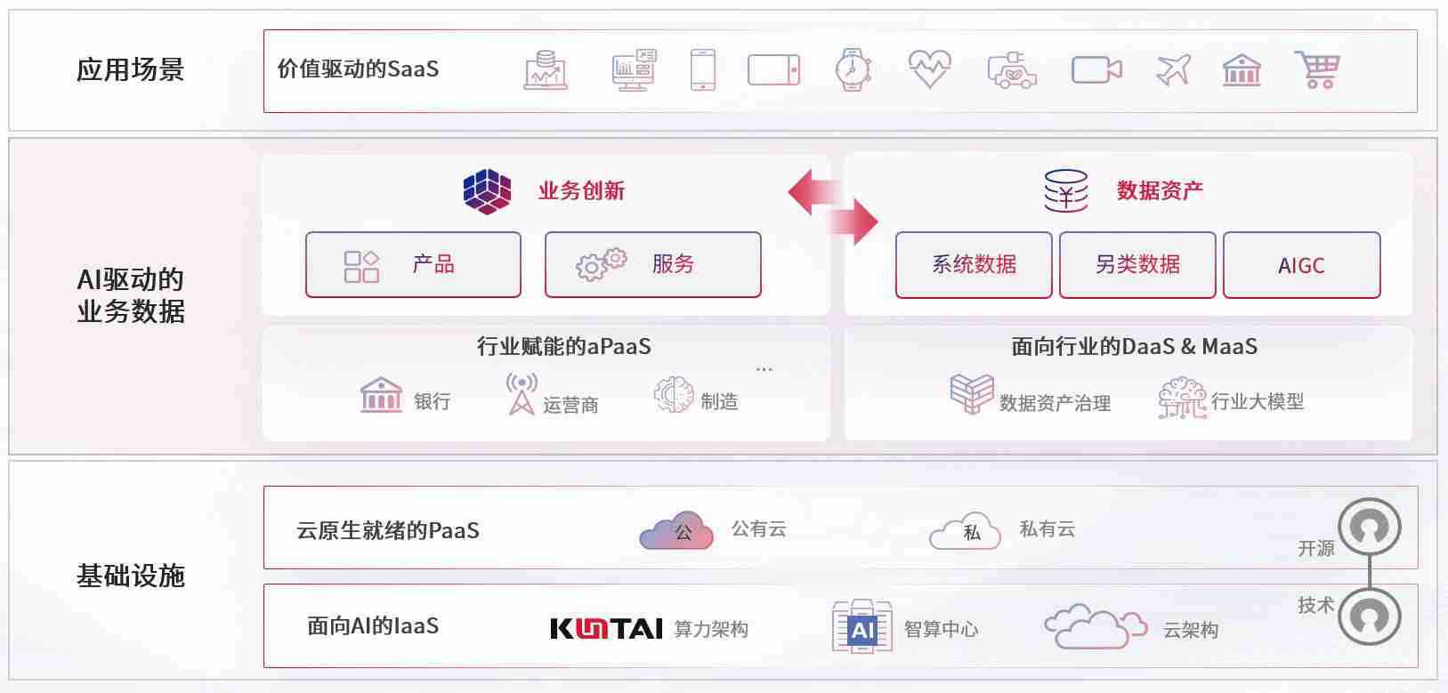 数字时代,,围绕企业数字化转型的关键要素,,NG28数码开创性的提出数云融合战略和技术体系框架,,,,着力在云原生、、、、数字原生、、、、AI原生和信创产业上架构产品和服务能力,,,为处在不同数字化转型阶段的快消零售、、汽车、、、、金融、、医疗、、、政企、、、、教育、、、运营商等行业客户提供泛在的敏捷IT能力和融合的数据驱动能力,,,,构建跨界融合创新的数字业务场景和新业务模式,,助力企业级客户建立面向未来的核心能力和竞争优势,,全面推动社会的数字化、、、智能化转型升级。。。